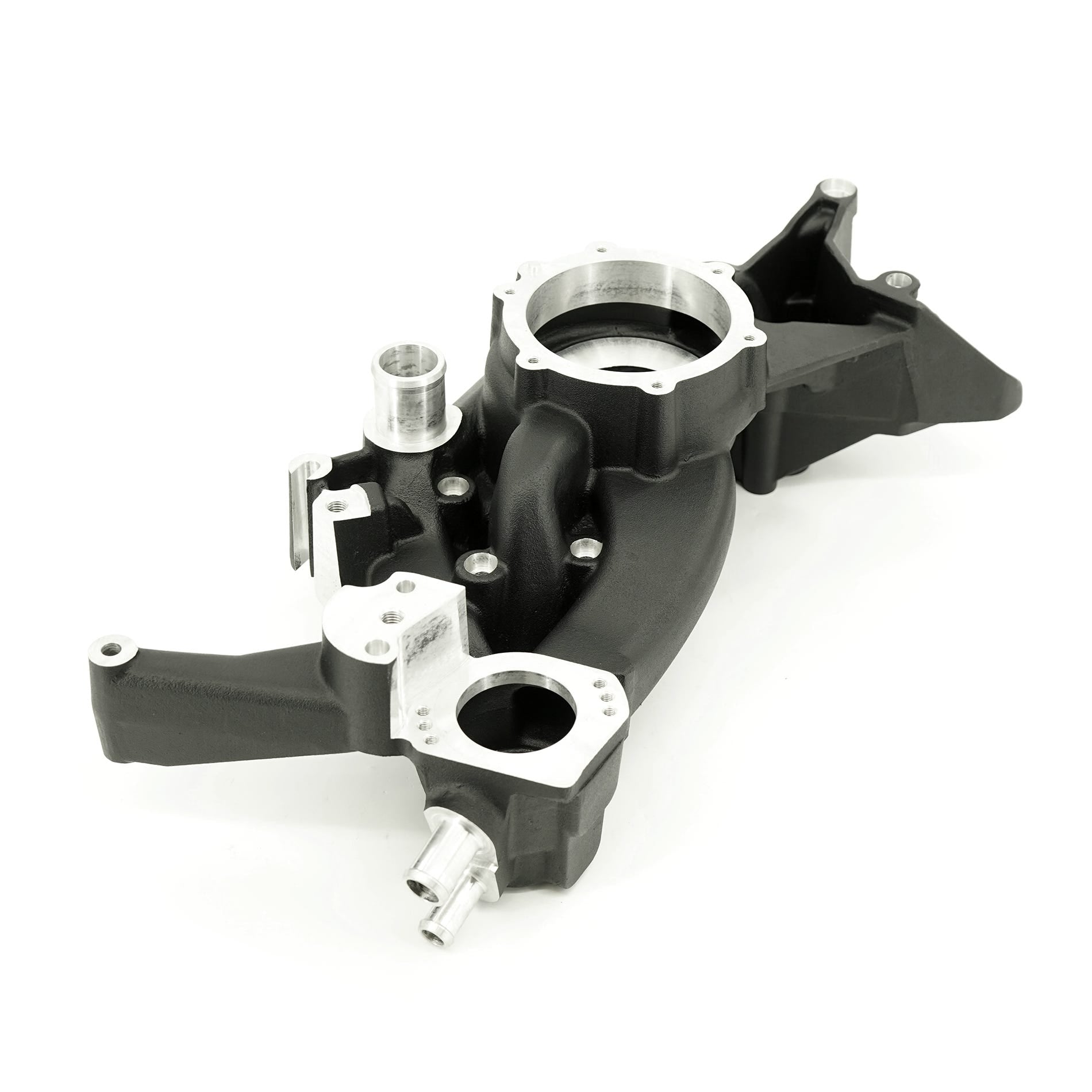- Machinable area on water manifold to relocate heater hose lines downward for added clearance