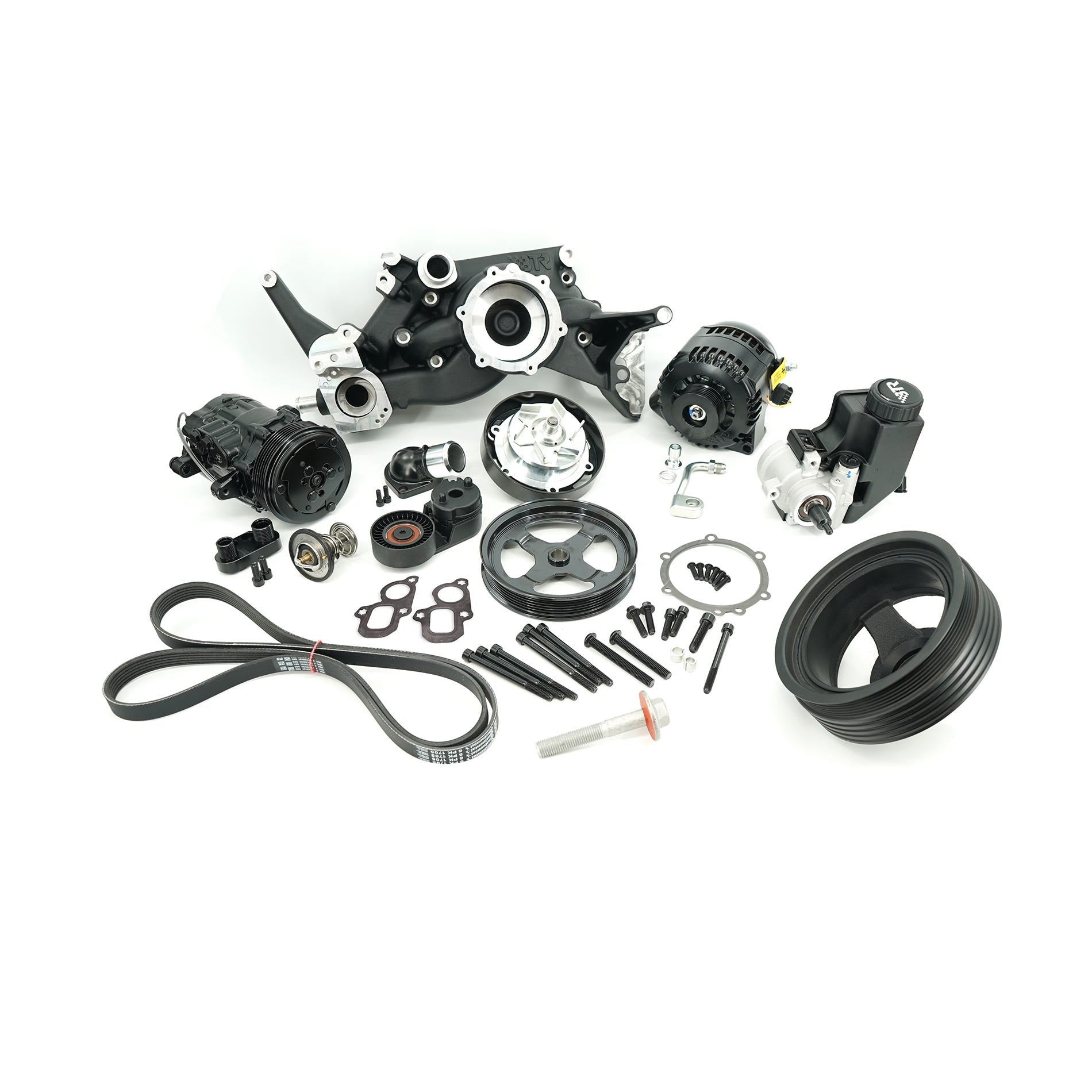 Comprehensive TRUE BLACK components and hardware for a clean look, and also available with billet pulley and tensioner dress-up kits!